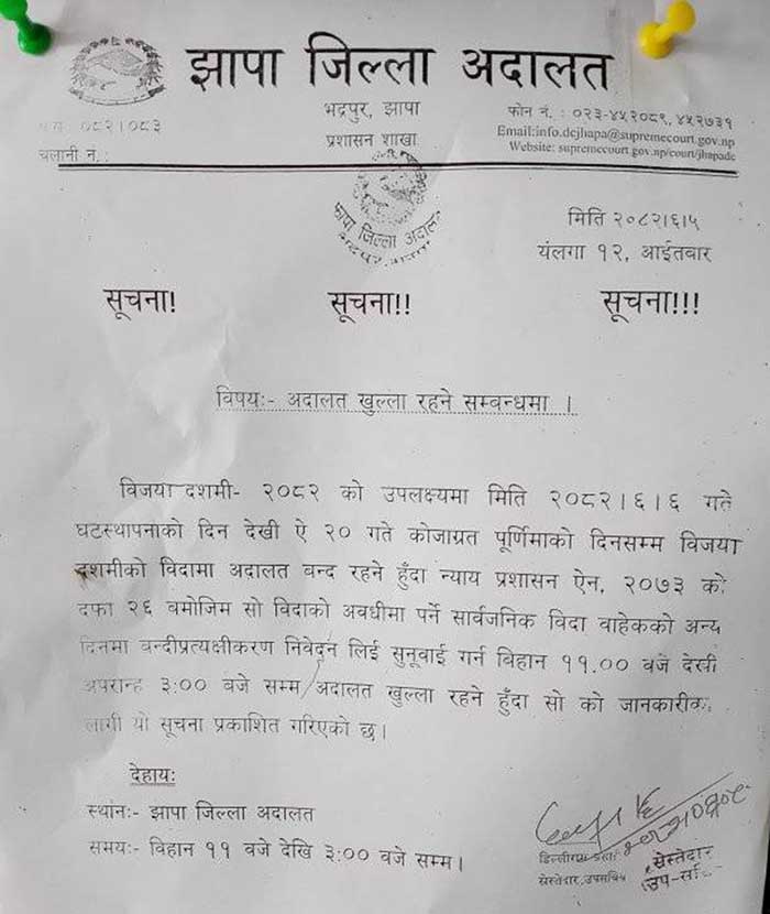 अदालतका सेस्तेदार उपसचिव डिल्लीराम प्रसाइले हस्ताक्षर गरेको अदालतको सूचनामा भनिएको छ, ‘न्याय प्रशासन ऐन, २०७३ को दफा २६ बमोजिम उक्त अवधिमा पर्ने घटस्थापना, विजयादशमी, कोजाग्रत पूर्णिमा र शनिबारको दिनबाहेक अन्य दिनहरूमा बन्दीप्रत्यक्षीकरणको रिट निवेदन लिई सुनुवाइ गर्न बिहान ११ः०० बजेदेखि अपराह्न ३ः०० बजेसम्म अदालत खुला रहने हुँदा सम्बन्धित सबैको जानकारीको लागि यो सूचना प्रकाशित गरिएको छ ।’
