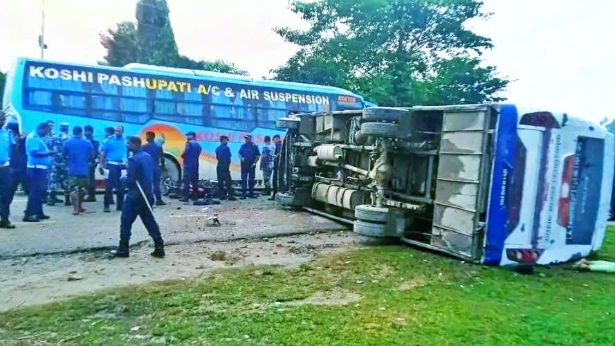 सप्तरी । उदयपुरको गाइघाटबाट झापाको काकडभिट्टा आउँदै गरेको बस दुर्घटनामा परेको छ। सप्तरीको बरमझियामा आज आइतबार बिहान करिब साढे ६ बजे बस र मोटरसाइकल एक आपसमा ठक्कर खाँदा एक जनाको घटनास्थलमै मृत्यु भएको छ भने २६ जना घाइते भएका छन्।