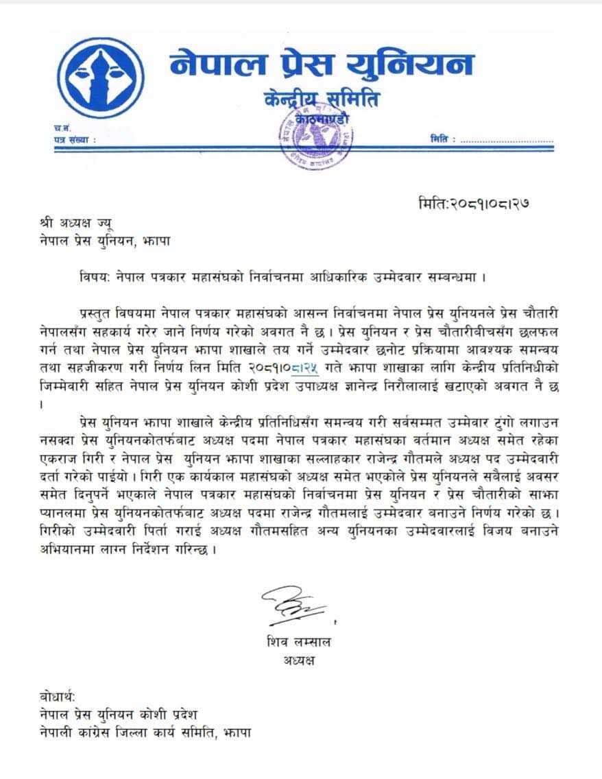 युनियन केन्द्रीय समितिका अध्यक्ष शिव लम्सालले प्रेस युनियन झापालाई आज एक पत्र लेख्दै गौतमलाई आधिकारी उम्मेदवारका रुपमा तोकिएकोले उनलाई विजय बनाउने अभियानमा लाग्न निर्देशन दिएपनि जिल्लाले भने एकराज गिरी अध्यक्षका उम्मेदवार रहेको घोषणा गरेको छ ।
