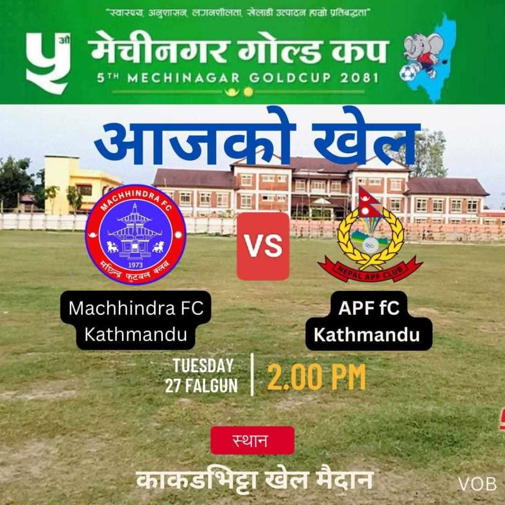 मेचीनगर। झापाको मेचीनगरमा जारी पाँचौं मेचीनगर गोल्डकप अन्तर्गत आज अन्तिम क्वाटरफाइनल खेल हुँदैछ । काँकरभिट्टा खेल मैदानमा आज ए डिभिजन क्लब मछिन्द्र एफसी काठमाडौं र विभागीय टिम शसस्त्र प्रहरीको एपीएफ एफसी काठमाडौं बिच खेल हुनेछ ।