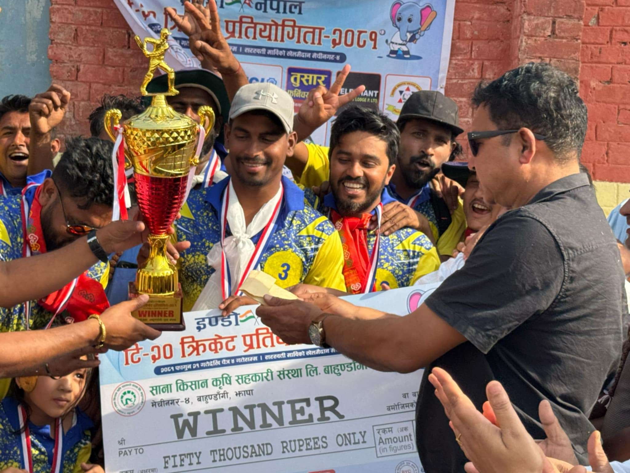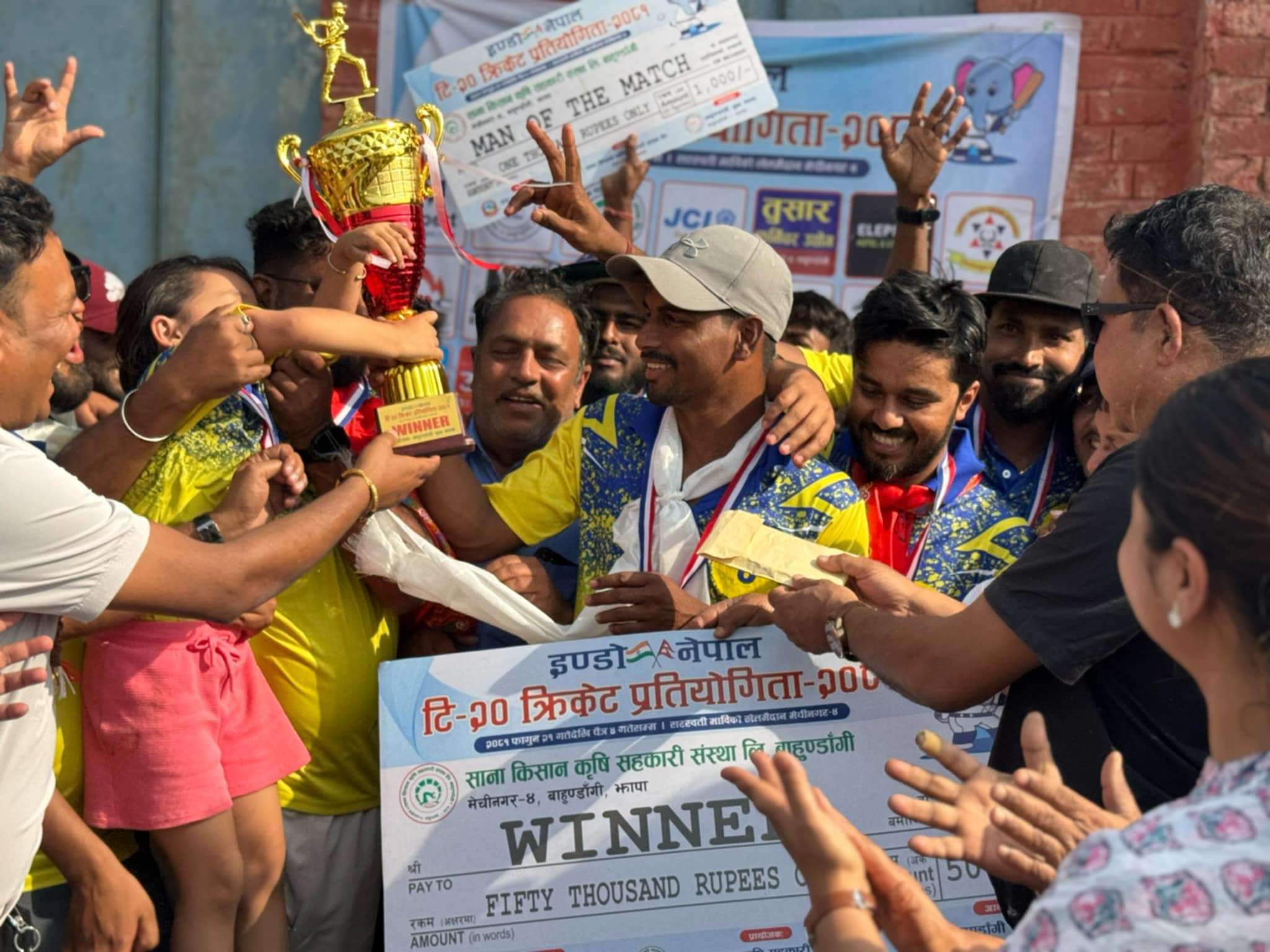 मेचीनगर । इण्डो–नेपाल टि–२० क्रिकेट प्रतियोगिताको उपाधि पेनोरिस -११ ले जितेको छ । मेचीनगर –४ बाहुण्डाँगीस्थित सरस्वती माविको खेल मैदानमा सोमबार सम्पन्न फाइनल खेलमा थण्डर्स – ११ लाई ७ विकेटले पराजित गर्दै पेनोरिस- ११ च्याम्पियन बनेको हो । विजेता पेनोरिस – ११ ले नगद रु ५० हजारसहित ट्रफी, मेडल र प्रमाणपत्र प्राप्त गरेको छ भने उपविजेता थण्डर्स -११ ले नगद रु ३० हजारसहित ट्रफी, मेडल र प्रमाणपत्र प्राप्त गर्यो ।