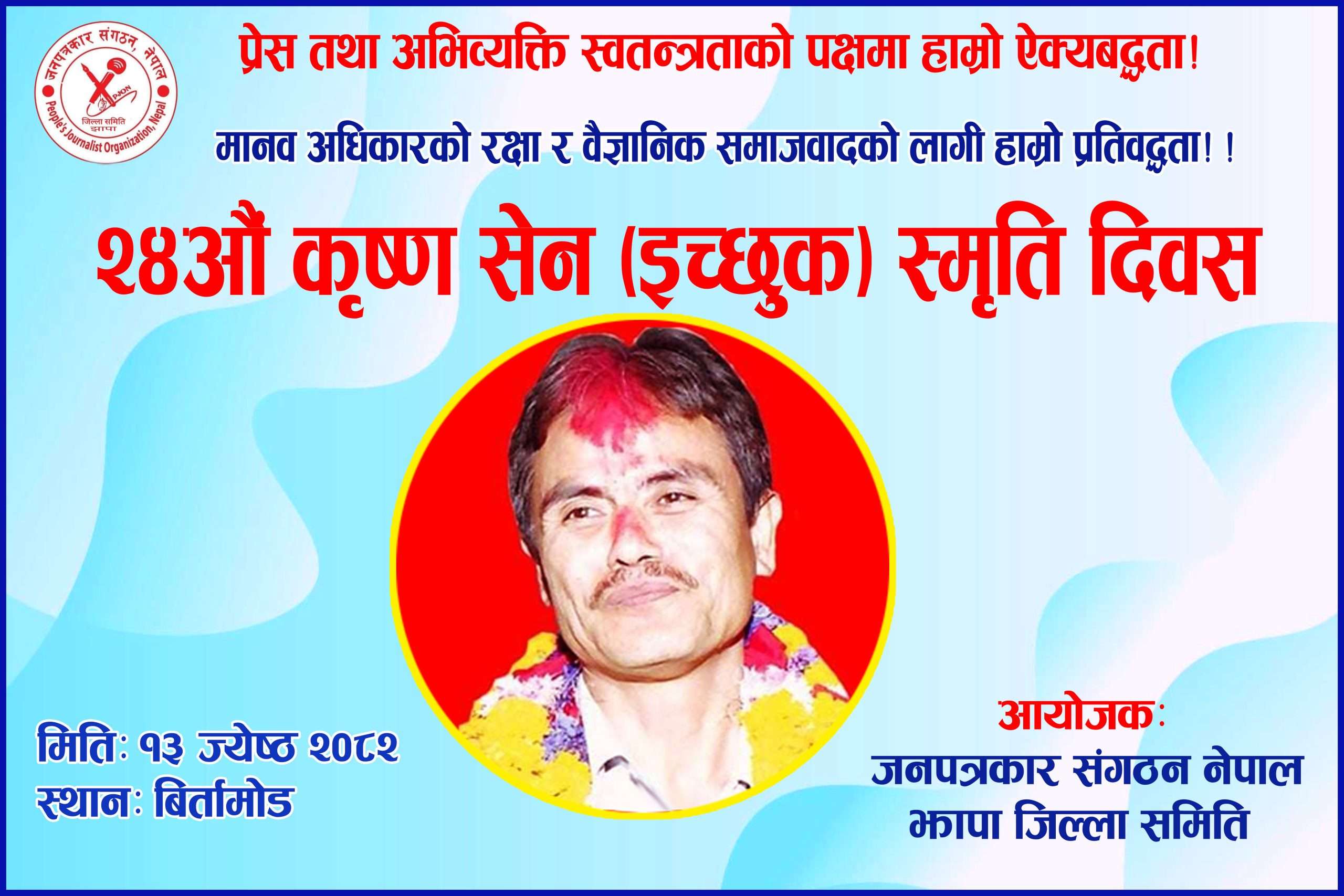 विर्तामोड । प्रेस तथा अभिव्यक्ति स्वतन्त्रता र मानव अधिकारको रक्षार्थ जीवन अर्पण गरेका क्रान्तिकारी पत्रकार, साहित्यकार एवम् लेखक कृष्ण सेन ‘इच्छुक’ को स्मृतिमा २४औं स्मृति दिवस झापाको विर्तामोडमा सम्पन्न भएको छ।