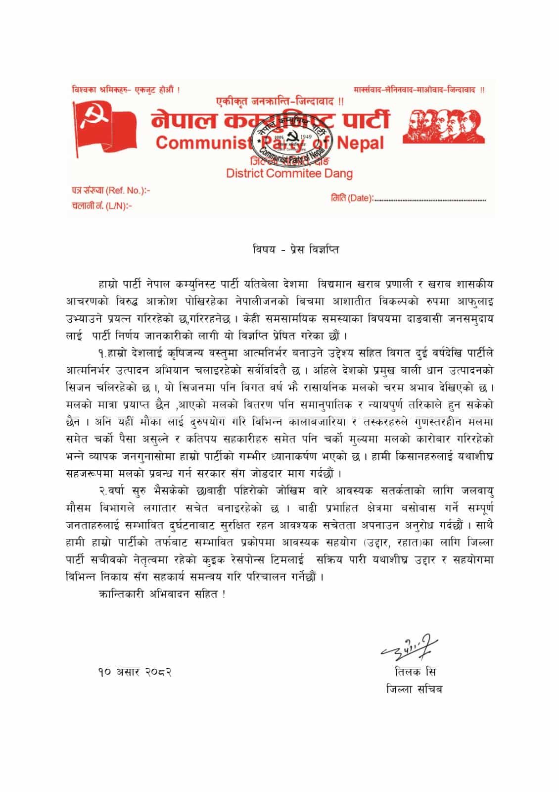 विज्ञप्तिमा भनिएको छ – ‘धान उत्पादनको सिजन चलिरहेको छ । मलको मात्रा पर्याप्त छैन्, आएको मल वितरण पनि समानुपातिक र न्यायपुर्ण छैन् । यहीँ मौकालाई दुरुपयोग गरि विभिन्न कालाबजारिया र तस्करहरुले गुणस्तरहिन मलमा समेत चर्को पैसा असुल्ने र कतिपय सहकारीहरुले समेत चर्को मुल्यमा मलको कारोवार गरिरहेको भन्ने व्यापक जनगुनासोमा हाम्रो पार्टीको गम्भीर ध्यानाकर्षण भएको छ ।’