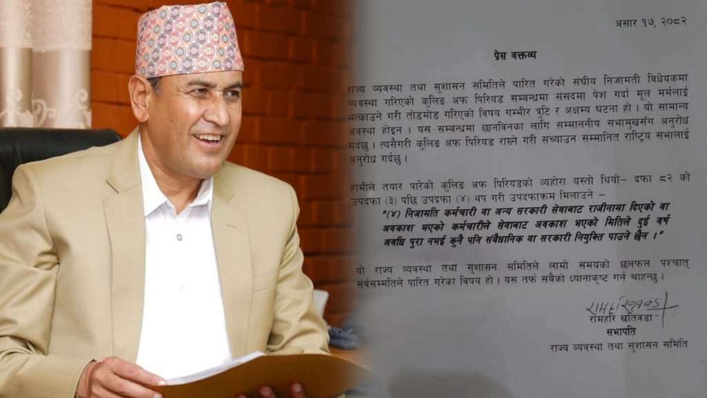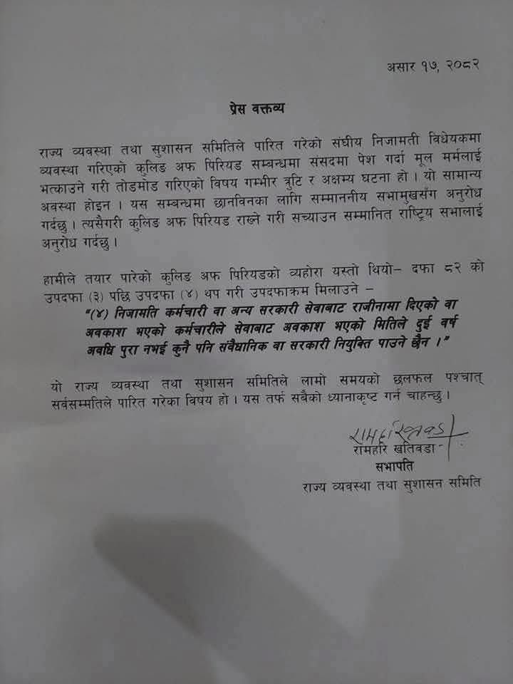 काठमाडौं । हालै राज्य व्यवस्था तथा सुशासन समितिले पारित गरेको निजामती विधेयकसँग सम्बन्धित विषयमा सामाजिक सञ्जालमा फैलिएको भ्रमप्रति समितिले खण्डन गरेको छ। समितिका सभापति रामहरि खतिवडाले एक प्रेस वक्तव्य जारी गर्दै पूर्व निजामती कर्मचारीलाई पुनः सरकारी सेवामा नियुक्ति दिनेबारे फैलाइएको प्रचारप्रति आपत्ति जनाएका छन्।