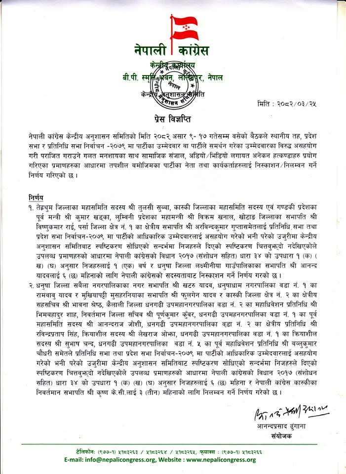 उनीहरूलाई १ वर्षका लागि पार्टी सदस्यताबाट निष्कासित गरिएको छ। त्यस्तै, धनुषाको लक्ष्मीनीया गाउँपालिका सभापति आनन्द यादवलाई ६ महिनाका लागि निष्कासन गरिएको छ।